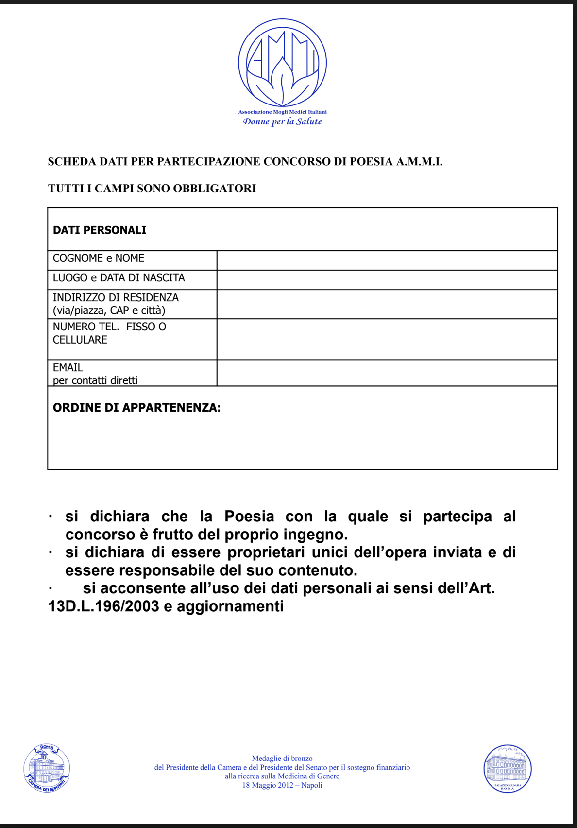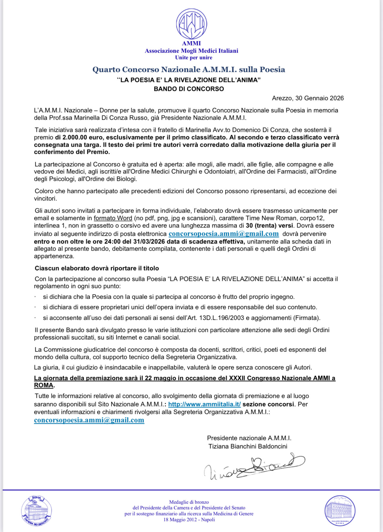 In allegato, troverete tutte le informazioni per la partecipazione al concorso la cui scadenza è il 31/03/2026. Il premio di euro 2.000,00 verrà assegnato al primo classificato in occasione del XXXII Congresso Nazionale AMMI a Roma il 22/05/2026.
